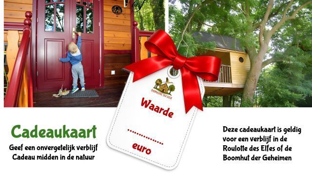 Met een cadeaukaart van Domaine du Der geeft u uw partner, een familielid of vriend(in) een heerlijk verblijf cadeau. Midden in de natuur, in onze Cabane aux Sectrets of de Roulotte des Elfes, met of zonder extra services (ontbijt in een mandje, sauna, fietsverhuur, etc.).