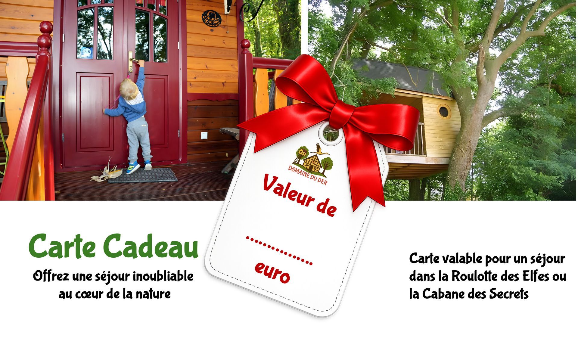 Avec un Carte Cadeau du Domaine du Der, offrez à votre partenaire, un membre de la famille ou un ami un merveilleux séjour. Au cœur de la nature, dans notre Cabane aux Secrets ou la Roulotte des Elfes, avec ou sans services supplémentaires (petit-déjeuner en panier, sauna, location de vélos, etc.).